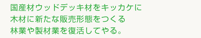 ウッドデッキ材をキッカケにして、木材の販売形態をつくり、林業や製材業を復活してやる。(心意気だけは大きいのだ。)