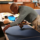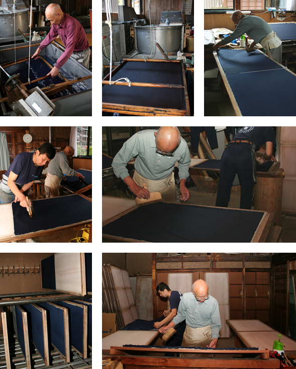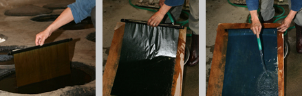 ▲市兵衛さんの奉書は、本藍染めめの工房で本藍染をします。 [藍につけ→乾かすこの作業を約15回ほど繰り返し、ようやく染まります。そのため、和紙自体に強度がないとできません。