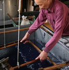 ▲漉き返し作業。濃藍にするには、このくらい濃い液の中で厚さを揃えた紙を漉きます。