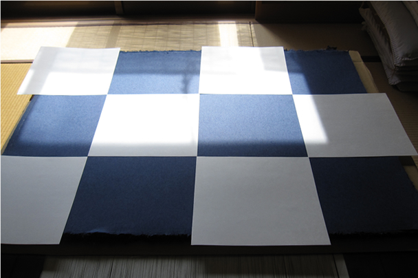 「ご覧下さい!!」一目瞭然、これ以上説明は要らないくらいのすばらしい出来栄えです。定期的に生漉奉書を藍で染めてもらうため、ある藍染工房にお願いしております。 正式なことが決まり次第、またご報告いたしますが、在庫が無くなりましたら、次期の販売の準備が整うまでは、お待ちいただくことになります。 つくるにも、また販売の体制を整えるにも、かなりの時間を要します。何卒ご理解を賜りますようお願いいたします。