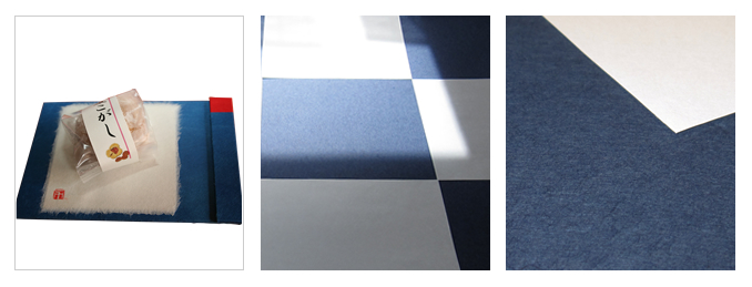 小川耕太郎∞百合子社では、試作中ですが、「薄藍色の奉書」も検討しています。 「白」「濃藍」「薄藍」の3色を揃えることによって、様々な用途にお応えできると考えております。 自然が創りだした繊細で深い色を、現代の暮らしの中でお楽しみください。
