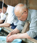 一本一本の繊維を光と水に透かしながら、 繊維についている細かい塵を見逃さないように除去します。 また少しでも変色した繊維があれば除去します。ちなみに煮熟に苛性ソーダ(薬品)を使うとすぐに塵が消えますが、同時に繊維も痛み、 楮のもつ美しい艶も無くなります。