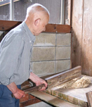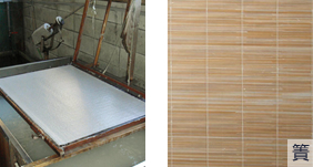 簀桁(紙漉き用の木枠)を前後に動かして繊維をすくいとります。市兵衛さんはコンマ何mmの範囲で漉き分けられるとか。 左の写真の簀は極細の竹ひごで一本一本途中で接いでいますが、和紙に接いだ所がうつらないよう、竹ひごの接ぎ方を工夫しています。 このような簀を作れる人は越前では2人だけです。
