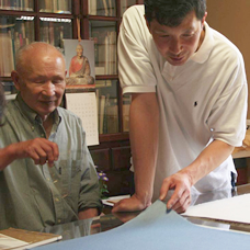 平成12年6月6日、8代目に続き人間国宝に認定される。和紙業界で人間国宝に認定されたのは3人。 そのうち3人が岩野さん親子。8代目は、水上勉の「弥陀の舞」の登場人物のイメージになったとも。9代目市兵衛さんは検品の際に、はねた紙はその場で紙を折り、 破棄してしまうそうです。品質に少しの妥協も許さない姿勢が伺えます。写真右は跡継ぎの順市さん。