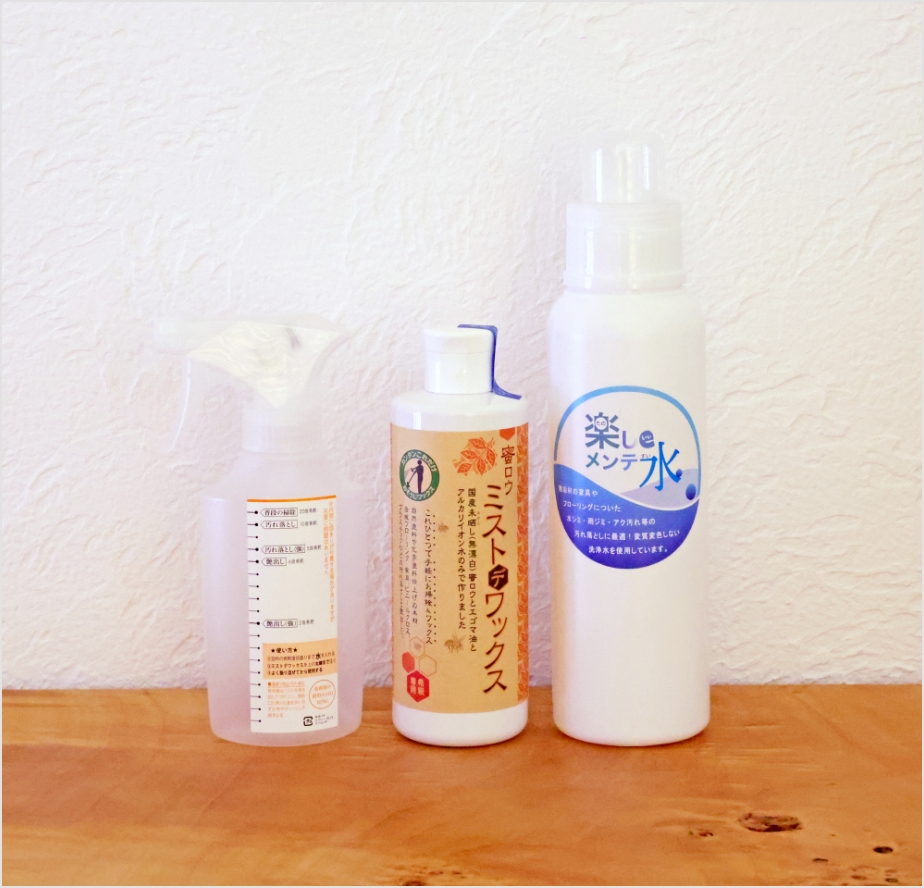 水道水で4倍から20倍に希釈したミストデワックスをシュッシュ。あとはさっとふき取るだけお掃除ついでにナチュラルなツヤもでます。