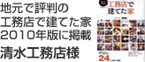 清水工務店●しみずこうむてん●社長は大工(親方)、二代目は設計士。構造材に紀州産を使用。木の性質を活かす手刻み加工、丈夫で安心出来る構造(耐震等級2以上)などをこだわりとする工務店。大工さんならではの高い技術と設計力を活かし、「住まい手」の要望にきめ細かく対応する。注文住宅で高い評価を受ける。