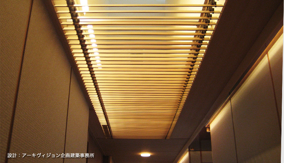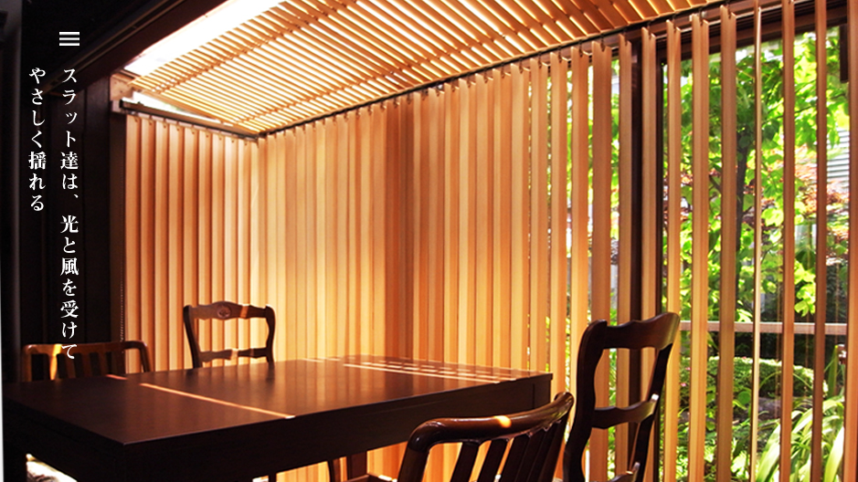 スラットの部分に希少な一枚板を使い、様々な窓(小~大の窓、カーブ、天窓、変型窓)に対応しております。
