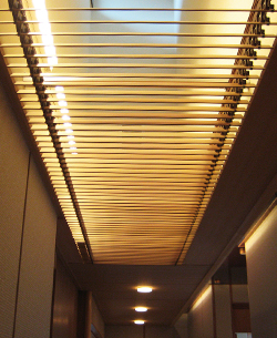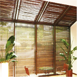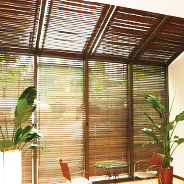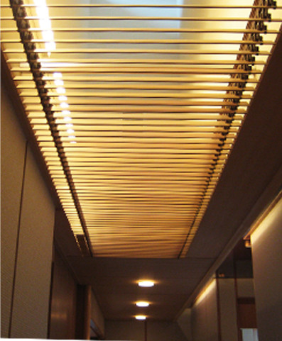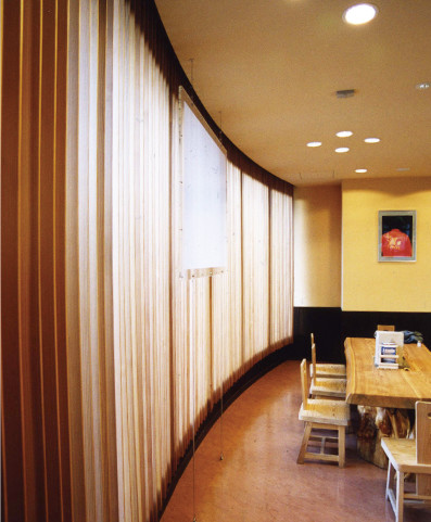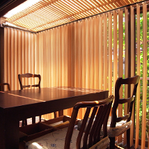 室内空間の表情を変える大切なポイントは、視覚に与える印象。スラッドの調節により自然光を調光できるので、スタイリッシュな壁面を演出します。スラッドの開閉により大きな窓(最大で幅5000mm、高さ3600mm)がプライベート空間に変わるのも魅力です。樹種は杉と檜をご用意しております。