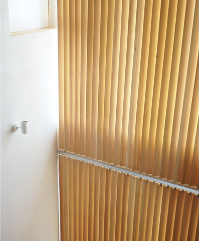幅380㎜(ギア式は450㎜~)からオーダーできますので、小窓~腰窓におすすめです。また斜のある天窓にも対応できます。木製ブラインドこかげのスラッドは一枚板でつくられているため、一般のブラインドより重厚感があるため、開閉の金具はクラッシュタイプと、手動による重さを軽減するためのギアタイプといった2つの金具をご用意しております。樹種は杉のみ。(オリジナルで桧またはその他の地域材などのご要望がございましたら、ご相談ください)