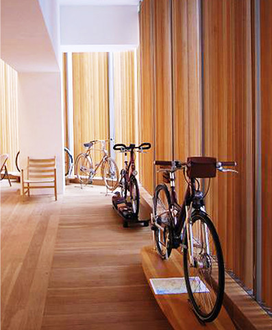 紀州檜は、年々光沢がでて経年と共に艶っぽくなります。色味はピンクかかったベージュ~明るい肌色のグラデーション。太陽の光がスラットを透過すると、室内に爽やかな新緑の森に入るかのような光を演出します。