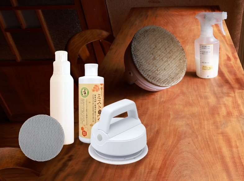木の表面には「蜜ロウ」で膜をつくり、木の中には「エゴマ油」を浸透させることで撥水効果が長もちさせながら、木材を保護します。