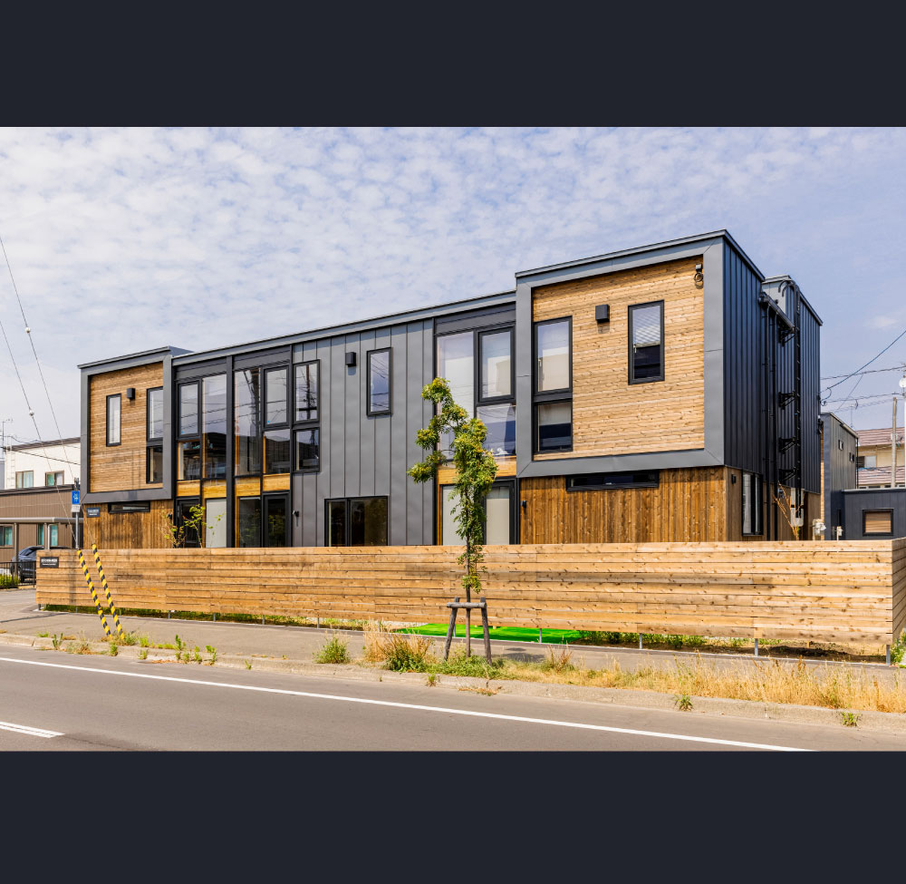 これまで培ってきた注文住宅のノウハウを生かし、クオリティはそのままのテラスハウス(長屋)の賃貸住宅。外観のポイントに地域材をつかっています。
